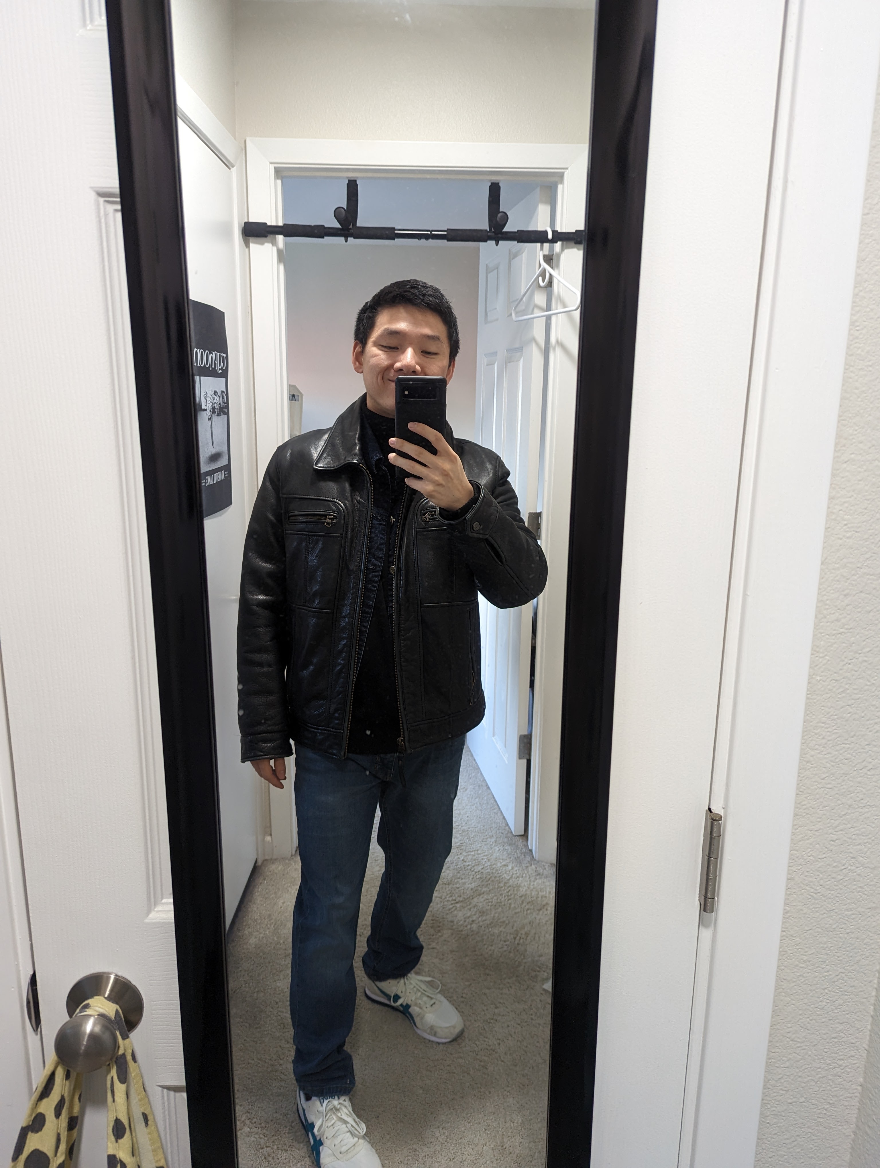 The top half of this outfit really pushed me out of my comfort zone! Years of wearing my cousin’s leftovers to school (and suffering in 90-degree heat) have turned me off turtlenecks for life. In fact, the one I’m wearing in this picture is the only one I own, and it was technically a Christmas gift from my mom. And although I’ve always thought leather jackets look great, I’ve rarely mustered the courage as an adult to break them out of my closet: they feel like they were made for people way cooler than I am, like motorcyclists or Soundcloud musicians. But if there’s one thing my co-worker wears a lot of, it’s black…and leather. I owed it to her to be as true to her aesthetic as possible.