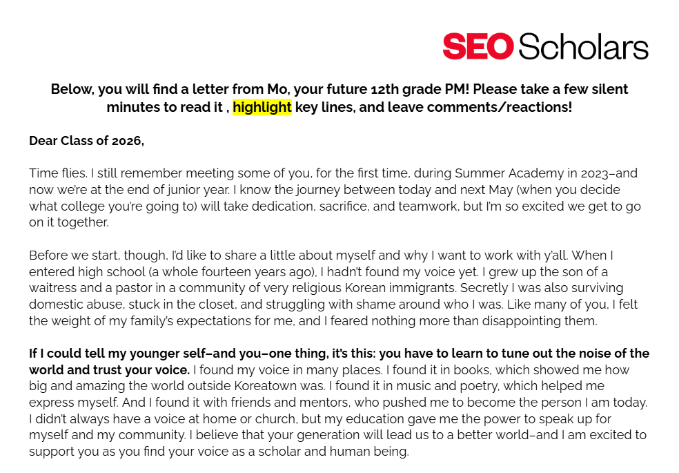 Here are artifacts from my time as a college advisor for first-generation and low-income students at SEO Scholars!